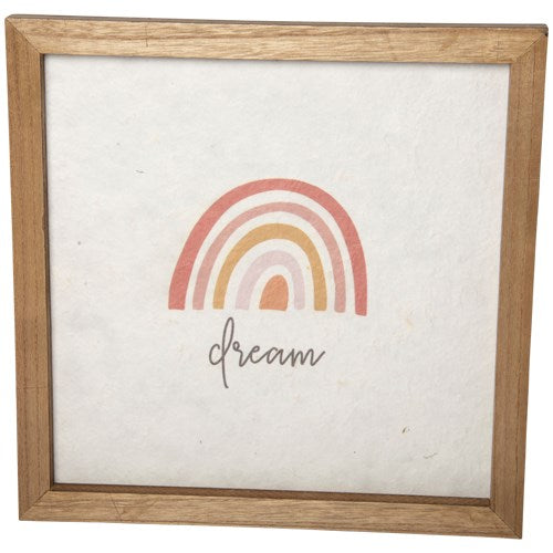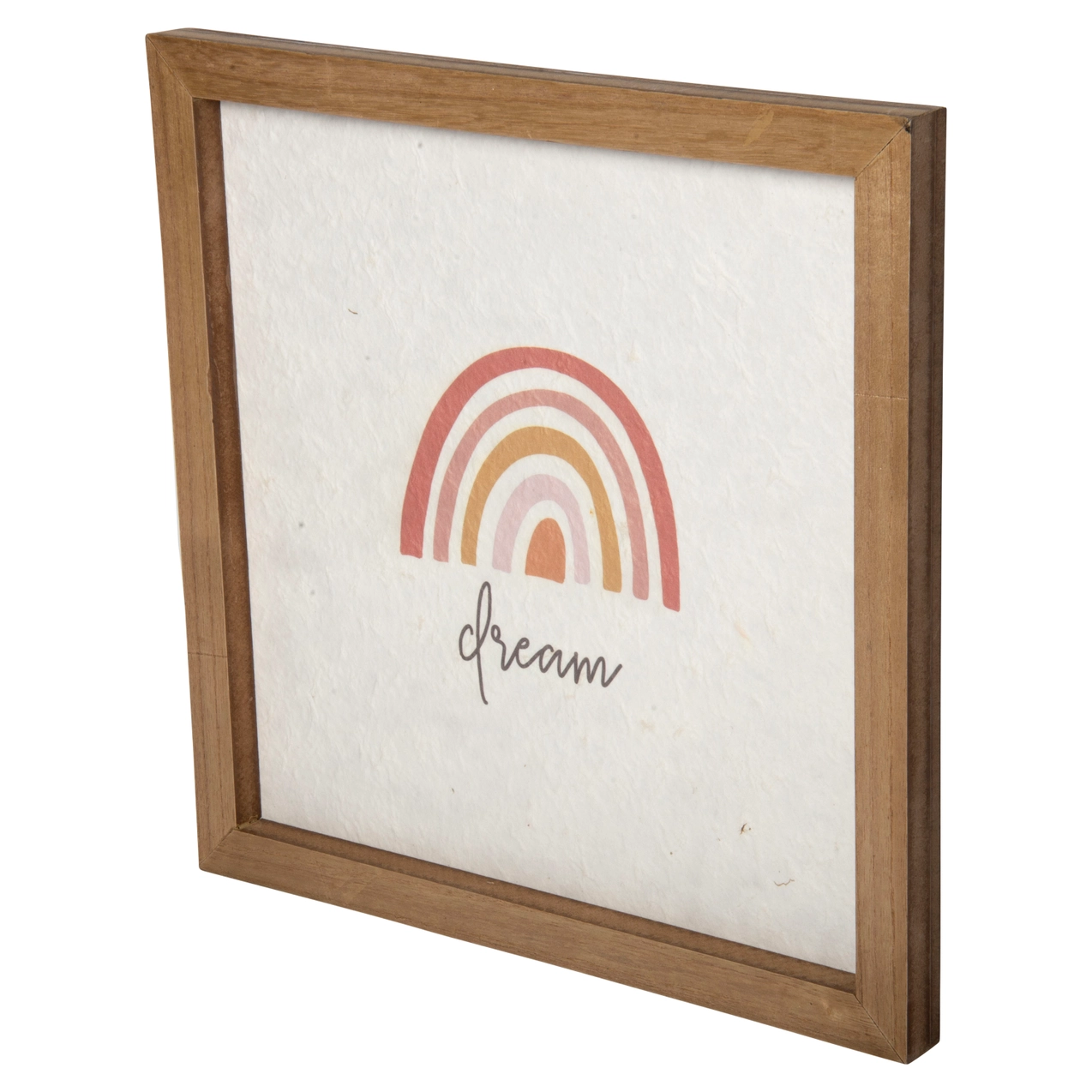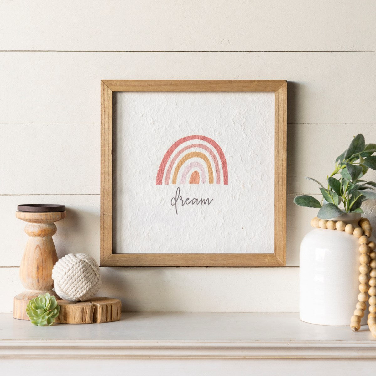 Beautiful Pastel Rainbow "dream" print showcased on handmade paper. Wooden frame with ready to hang sawtooth on the back.